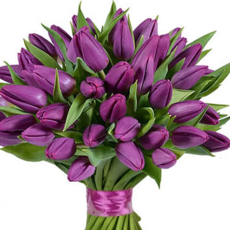 Букет состоит из 45 сиреневых тюльпанов, прозрачная упаковка, атласная лента.