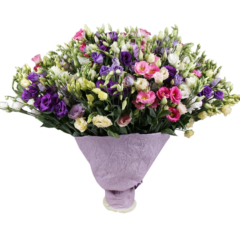 Букет состоит из MIX из 101 ветки эустомы, красивая упаковка, атласная лента.