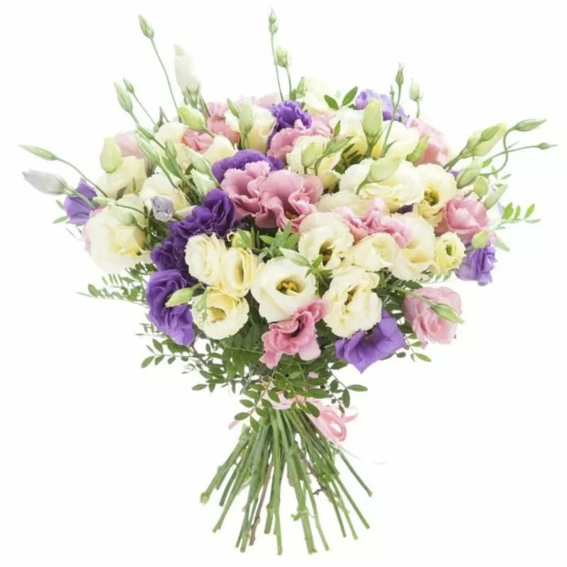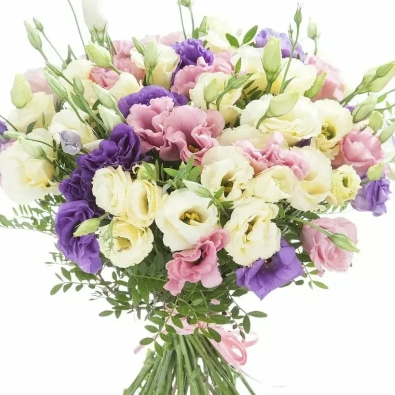 Букет состоит из MIX из 17 веток эустомы, прозрачная упаковка, атласная лента.