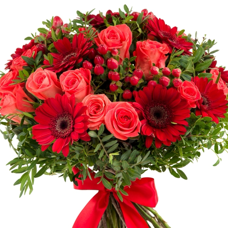 Букет состоит из 15 коралловых роз, 12 красных гербер, 5 гиперикум, зелень, прозрачная упаковка, атласная лента.