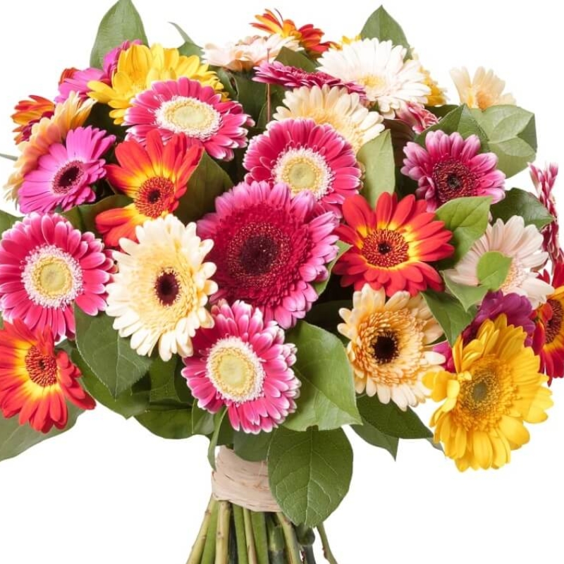 Букет состоит из MIX из 29 гербер, зелень, прозрачная упаковка, атласная лента.