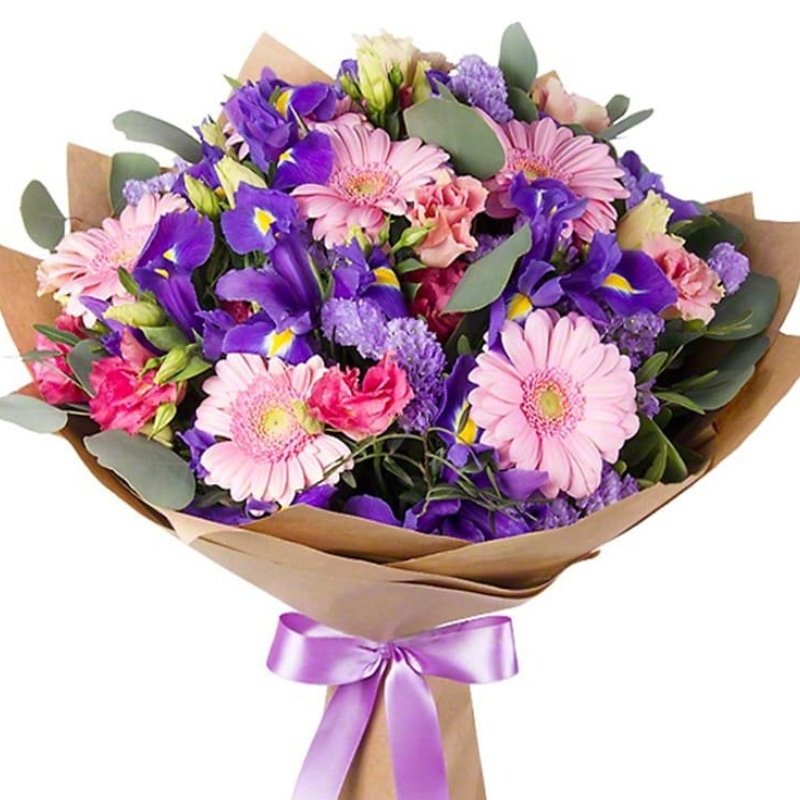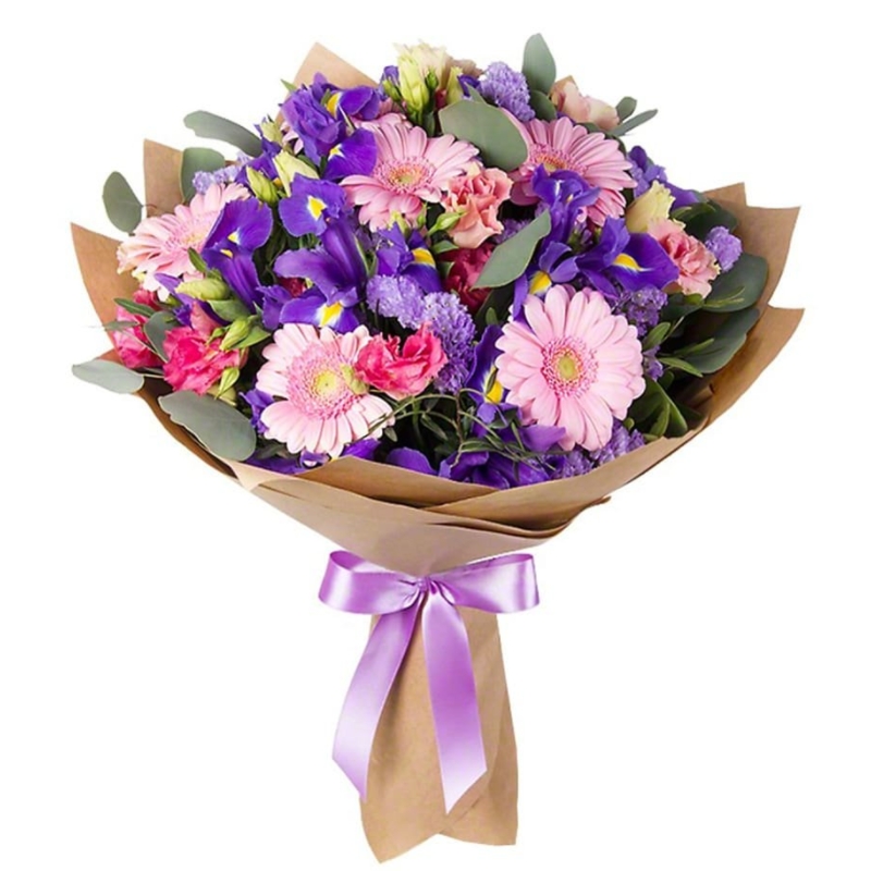 Букет состоит из 7 розовых гербер, 10 ирисов, 4 эустомы, 2 статицы, зелень, крафт, атласная лента.