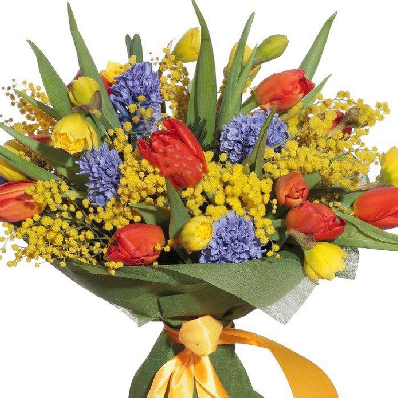 Букет состоит из 10 тюльпанов, 9 нарциссов, 5 гиацинтов, 5 веток мимозы, красивая упаковка, атласная лента.