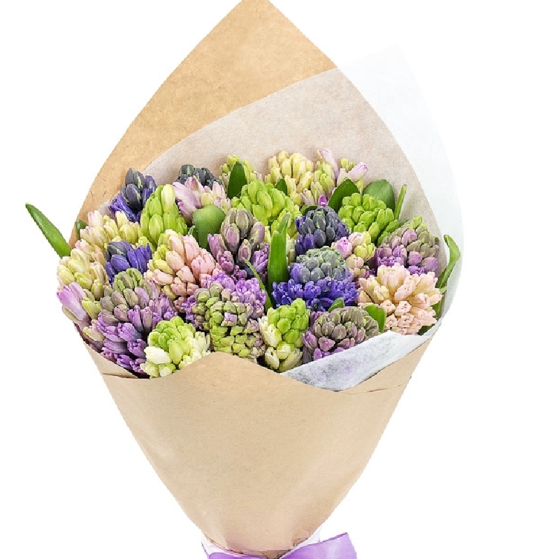 Букет состоит из 21 гиацинт, крафт, атласная лента.