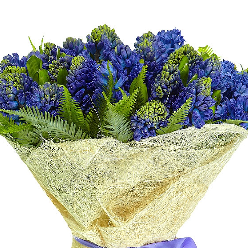 Букет состоит из 35 синих гиацинтов, красивая упаковка, атласная лента.