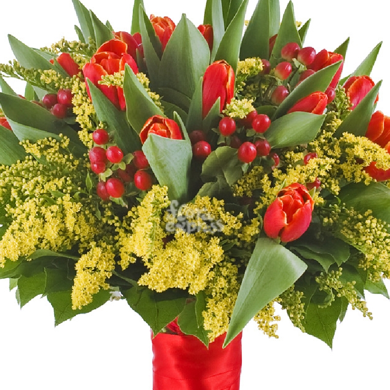 Гиперикум 5 шт., Мимоза 11 шт., Тюльпан 15 шт. |