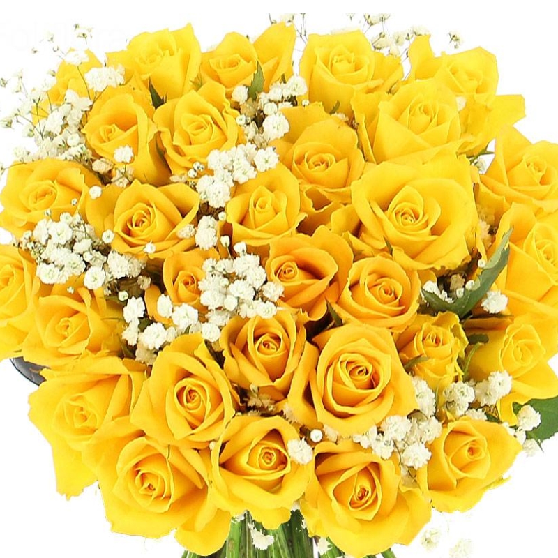 Букет состоит из 55 желтых роз, 3 гипсофила, прозрачная упаковка, атласная лента.