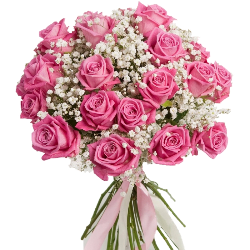 Букет состоит из 25 розовых роз, 6 веток гипсофилы, прозрачная упаковка, атласная лента.