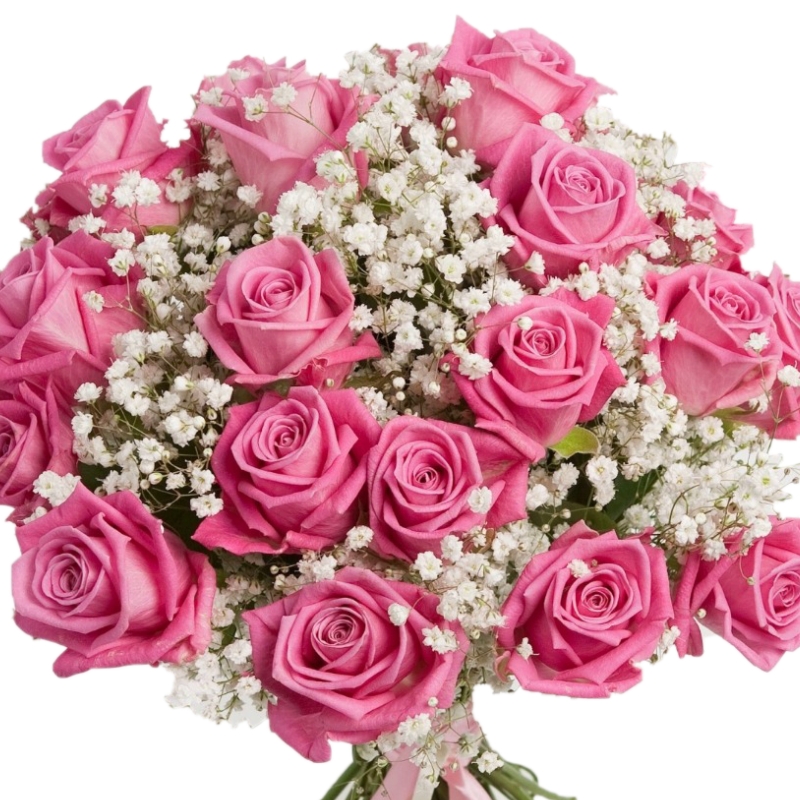 Букет из розовых роз с гипсофилой