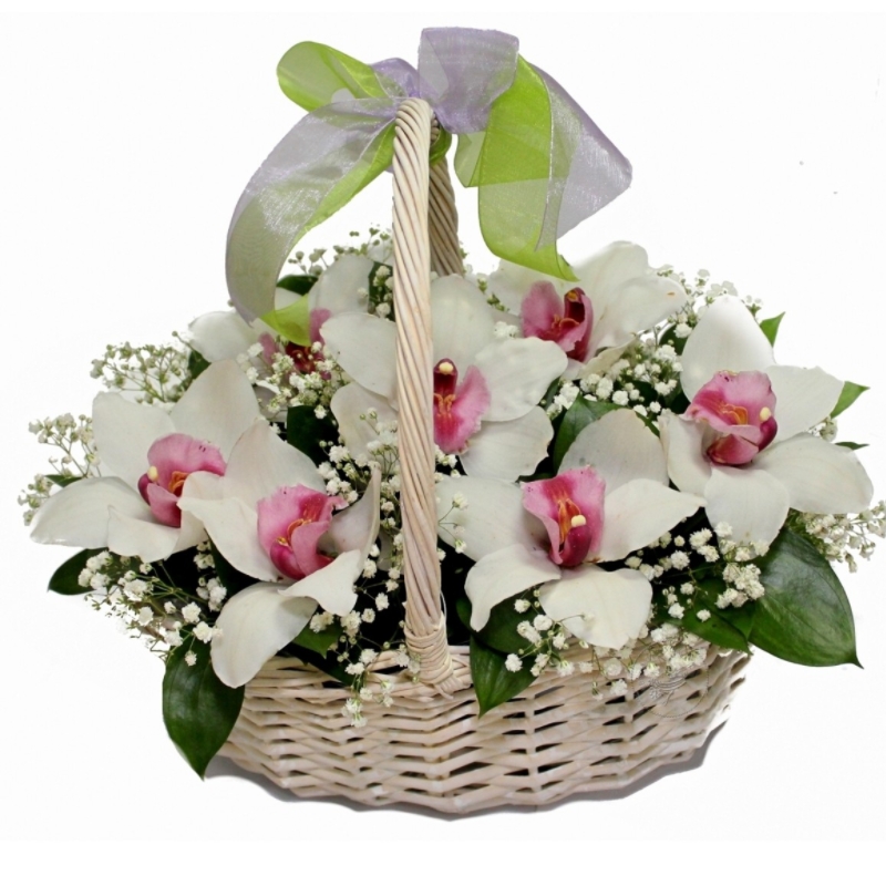 Букет состоит из 7 орхидей, 5 гипсофила, зелень, корзина, оазис.