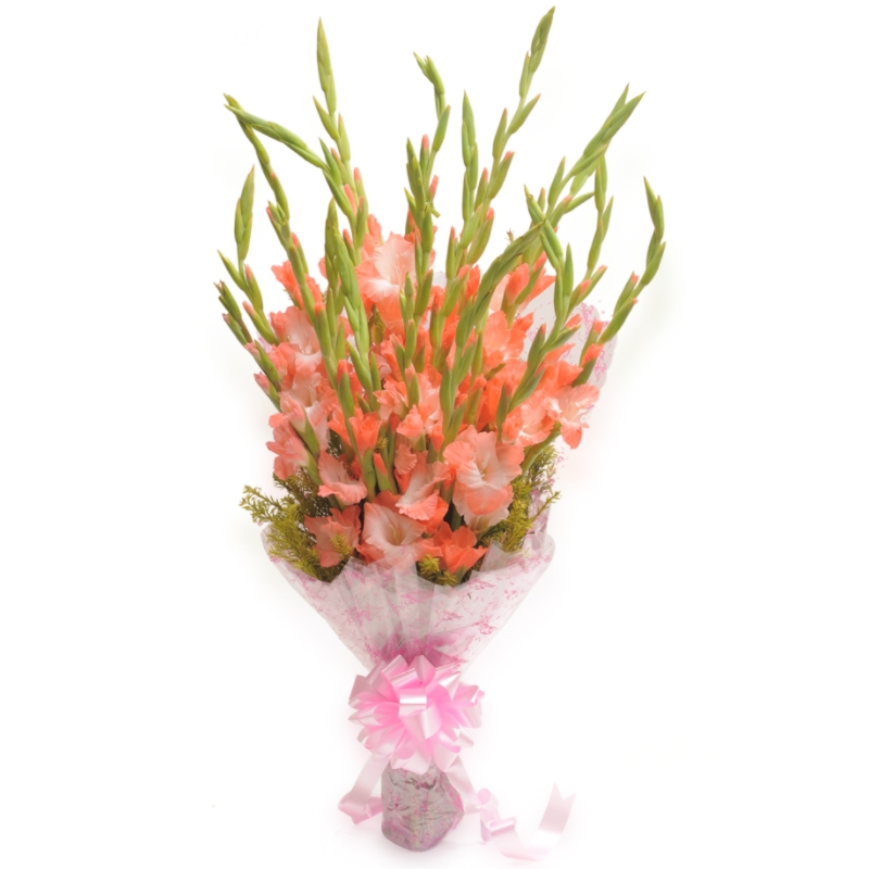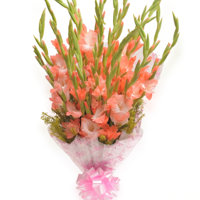 Букет состоит из 21 коралловый гладиолус, декоративная зелень, красивая упаковка, атласная лента.