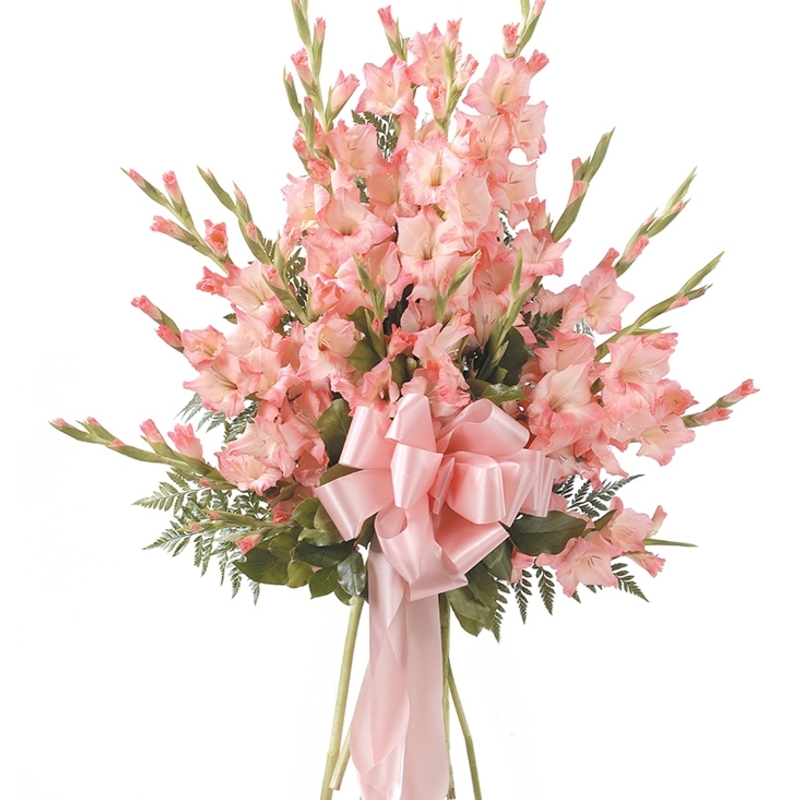 Букет состоит из 19 розовых гладиолусов, зелень, прозрачная упаковка, атласная лента.