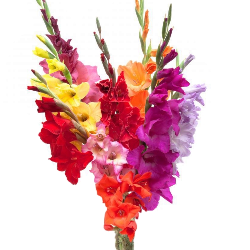 Букет состоит из MIX из 19 гладиолусов, прозрачная упаковка, атласная лента.