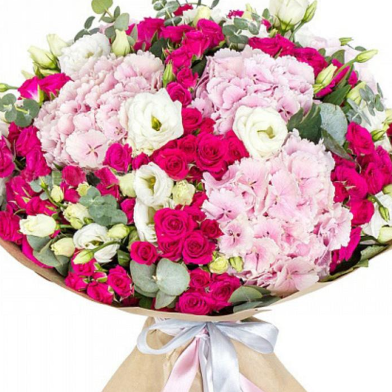 Букет состоит из 3 розовые гортензии, 20 красных кустовых роз, 10 веток эустомы, зелень, крафт, атласная лента.