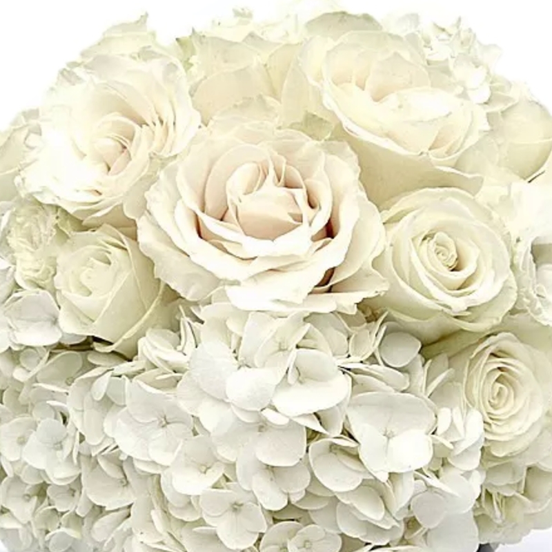 Букет состоит из 6 белых гортензий, 9 белых роз, коробка, оазис.