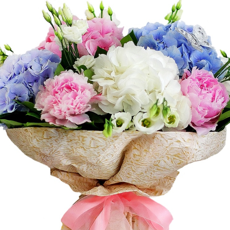Букет состоит из 2 синие гортензии, 1 белая гортензия, 1 розовая гортензия, 5 розовых пионов, 10 белых эустом, зелень, красивая упаковка, атласная лента.