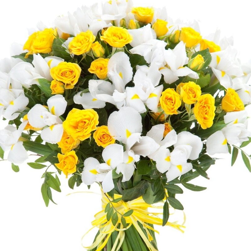 Букет состоит из 35 белых ирисов, 10 желтых кустовых роз, прозрачная упаковка, атласная лента.