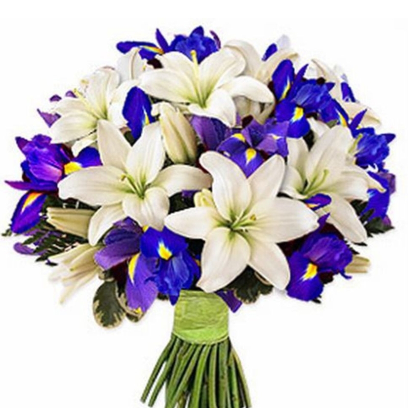 Букет состоит из 5 лилий, 19 ирисов, прозрачная упаковка, атласная лента.