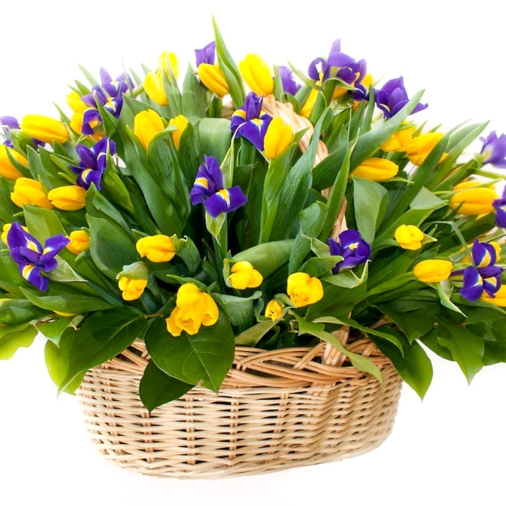 Букет состоит из 75 желтых тюльпанов, 35 ирисов, зелень, корзина.