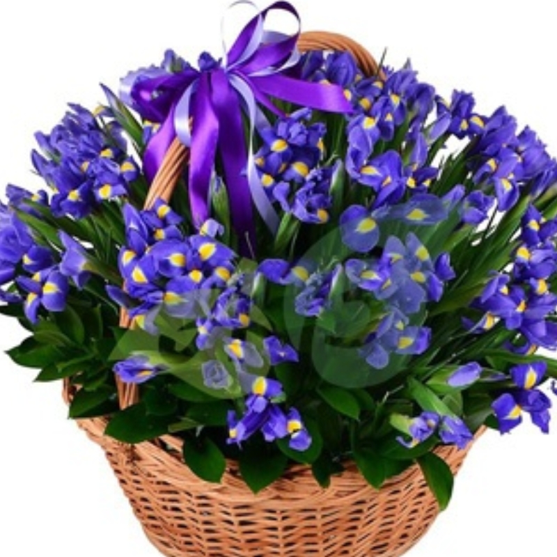 Букет состоит из 51 ирис, зелень, корзина, атласная лента.
