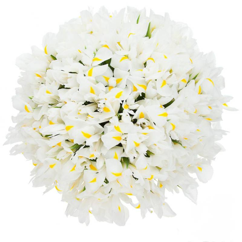 Букет состоит из 51 белый ирис, прозрачная упаковка, белая лента.