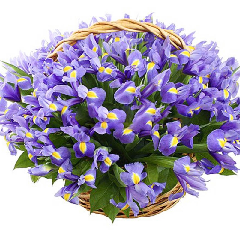 Букет состоит из 75 ирисов, зелень, корзина.