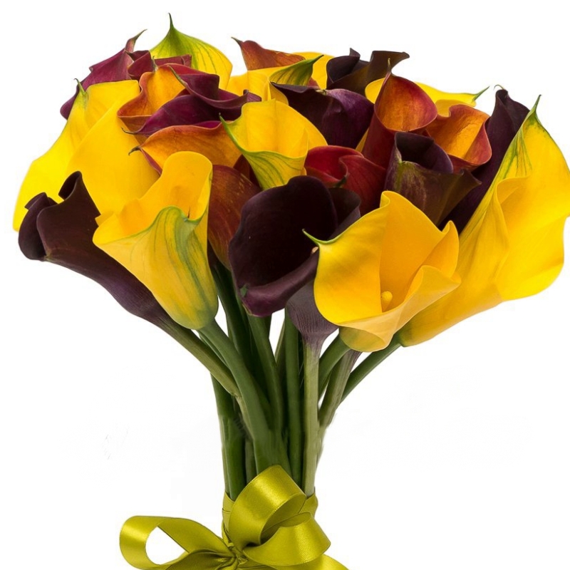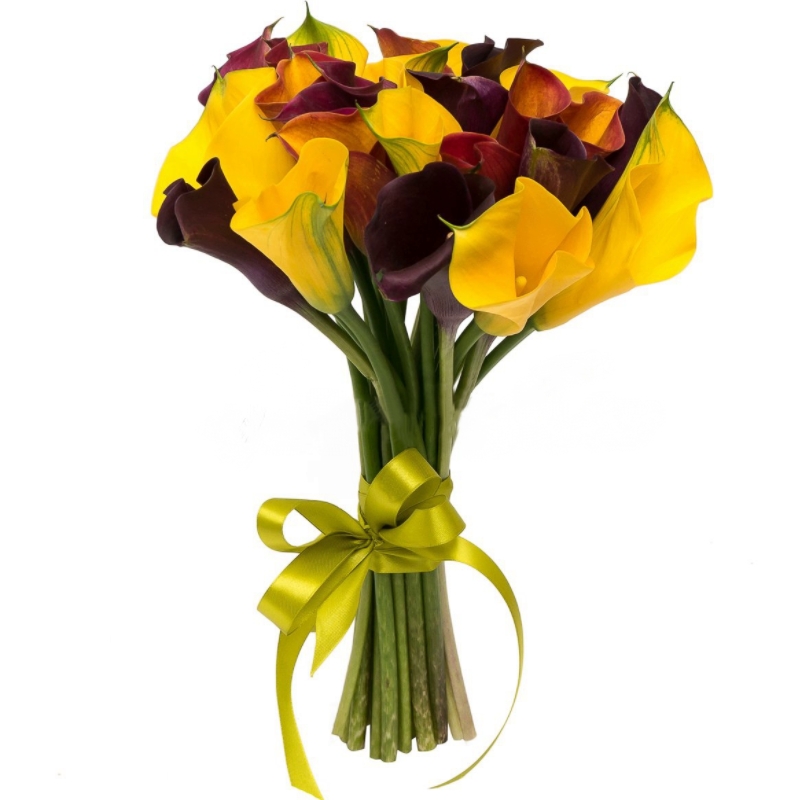Букет состоит из MIX из 25 желтых и бордовых калл, прозрачная упаковка, атласная лента.