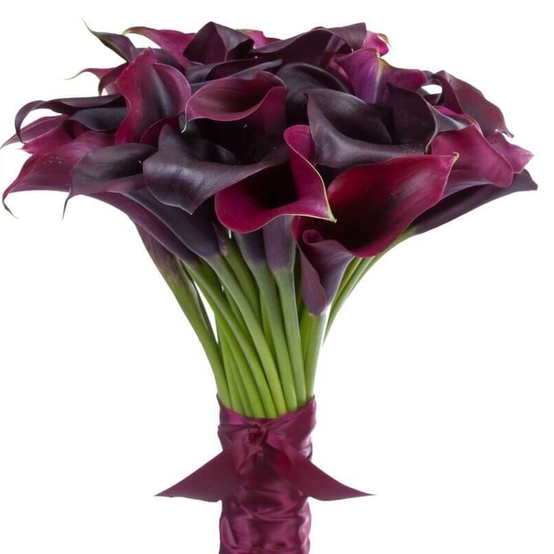 Букет состоит из 25 бордовых калл, прозрачная упаковка, атласная лента.