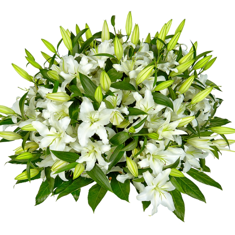 25 веток белых лилий, корзина, оазис.
