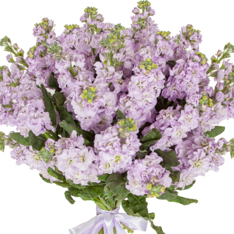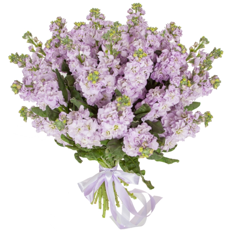 Букет состоит из 27 сиреневых маттиол, прозрачная упаковка, атласная лента.
