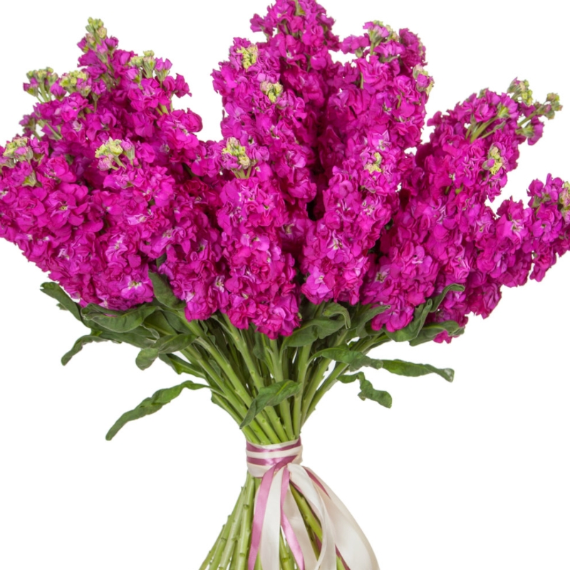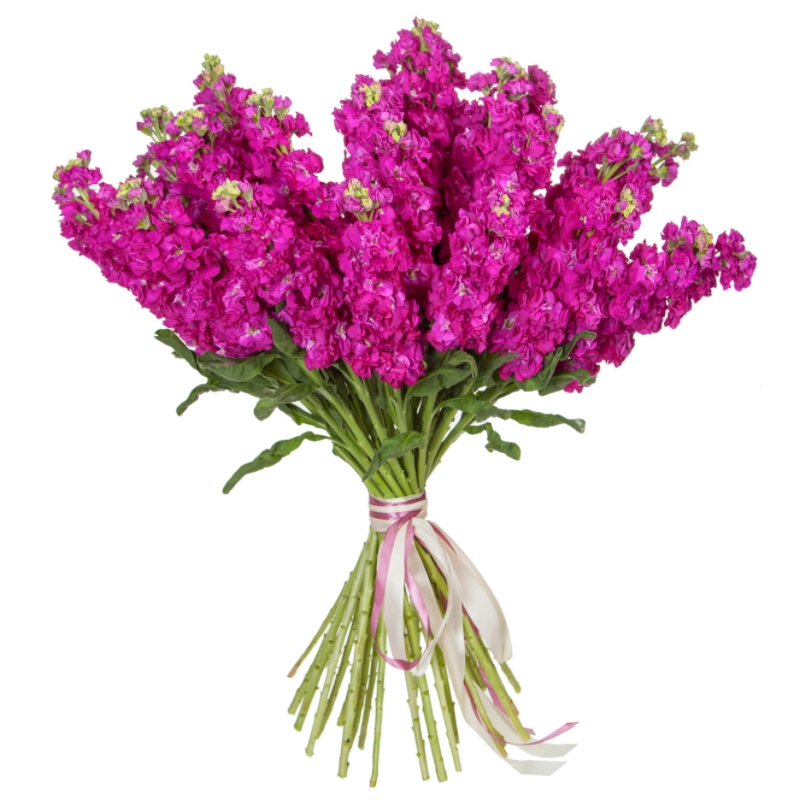 Букет состоит из 19 малиновых маттиол, прозрачная упаковка, атласная лента.