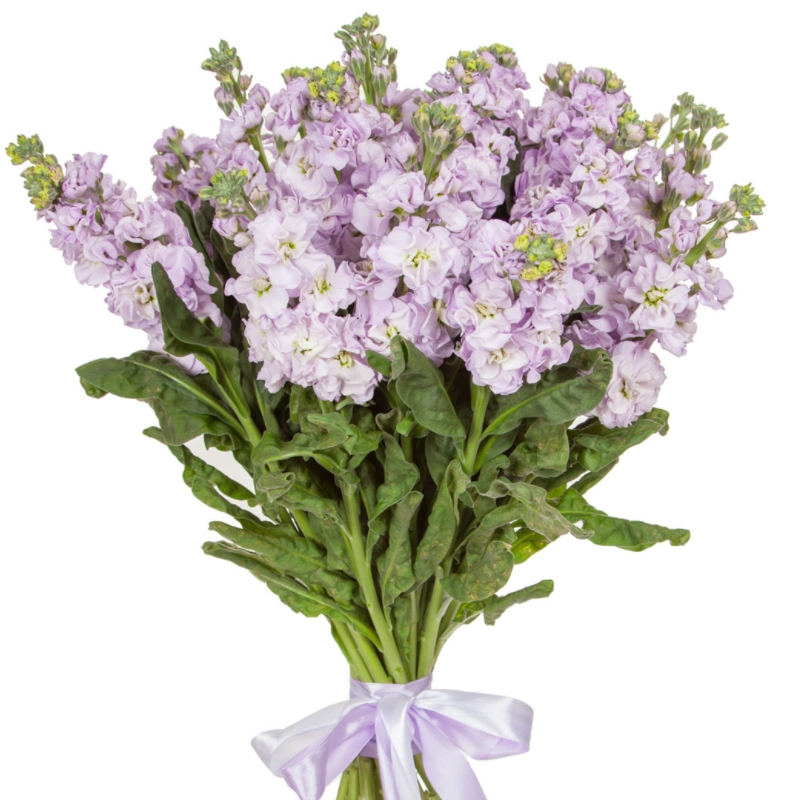 Букет состоит из 19 сиреневых маттиол, прозрачная упаковка, атласная лента.