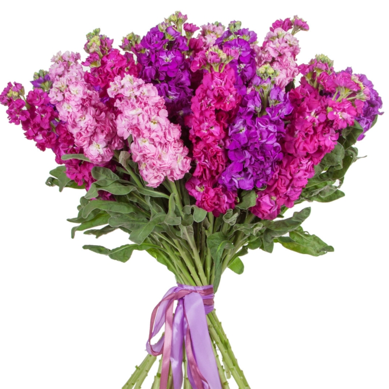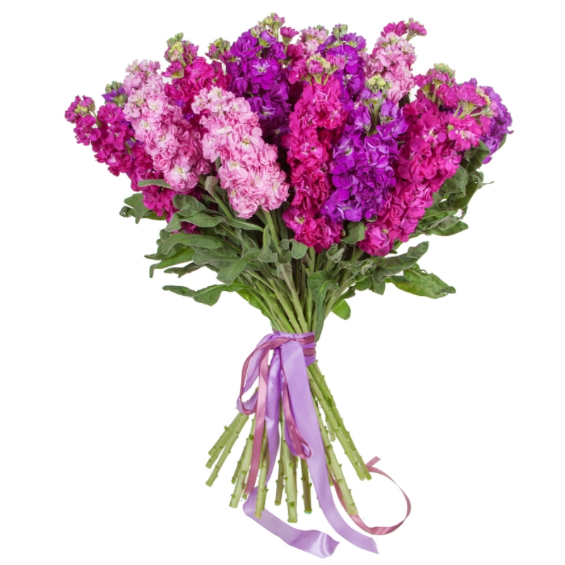 Букет состоит из MIX из 27 маттиол, прозрачная упаковка, атласная лента.