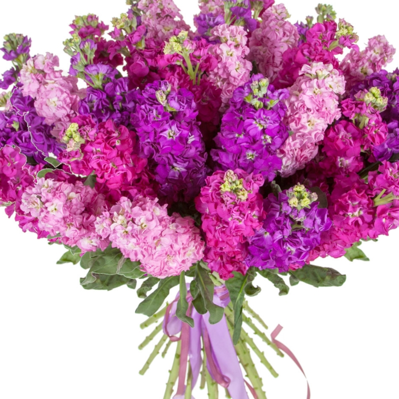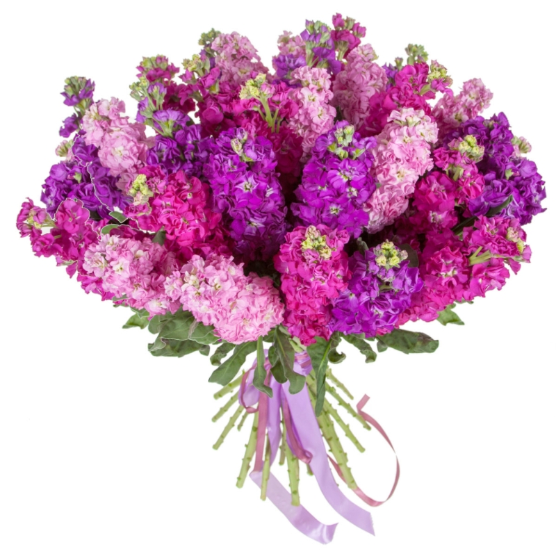 Букет состоит из MIX из 31 маттиолы, прозрачная упаковка, атласная лента.