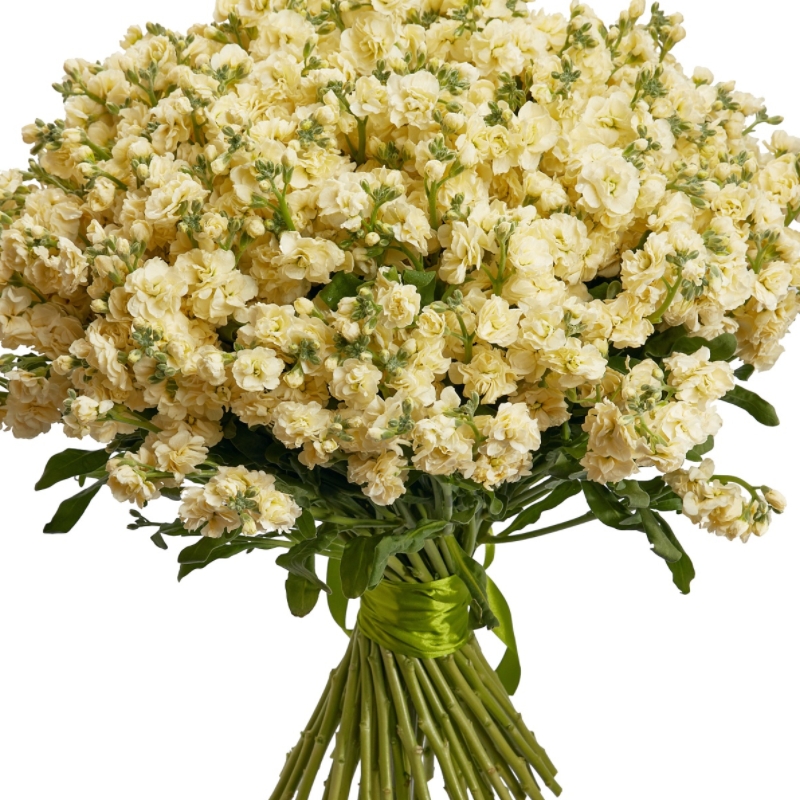 Букет состоит из 45 кремовых маттиол, прозрачная упаковка, атласная лента.