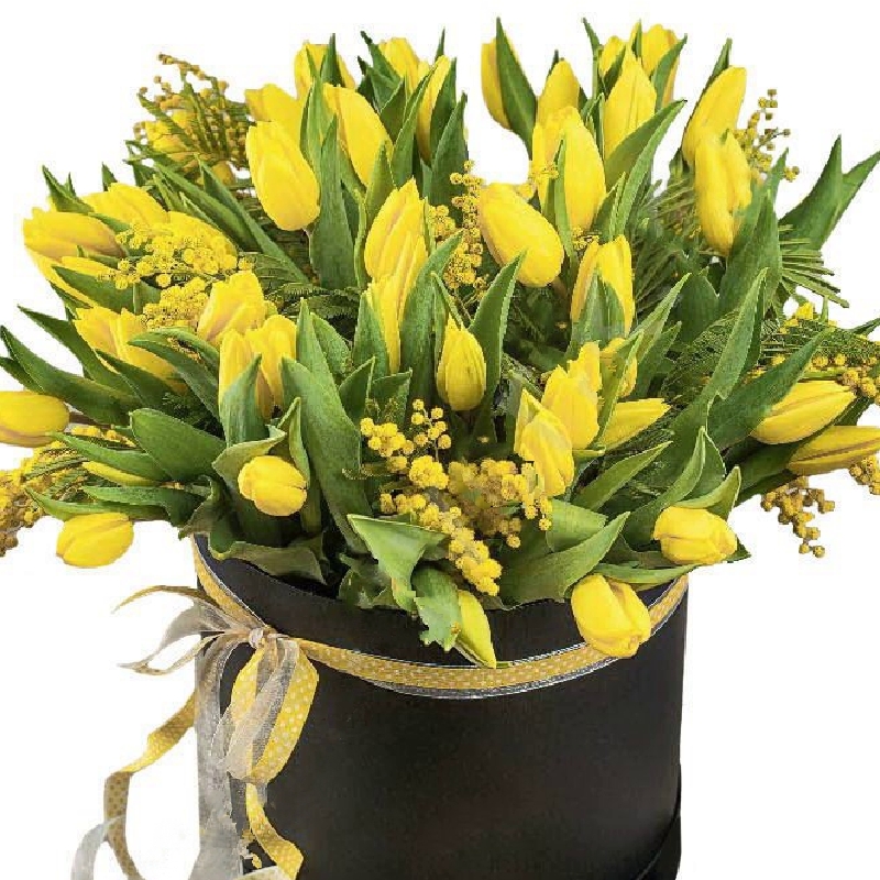 Букет состоит из 45 желтых тюльпанов, 6 веток мимозы, коробка, оазис.