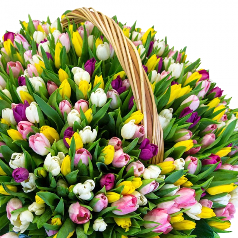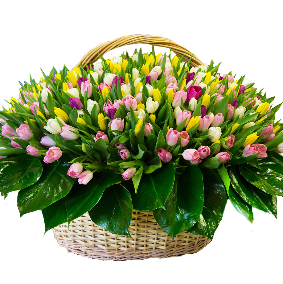 MIX из 201 тюльпана, зелень, корзина, оазис.