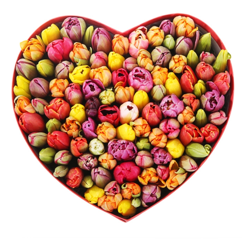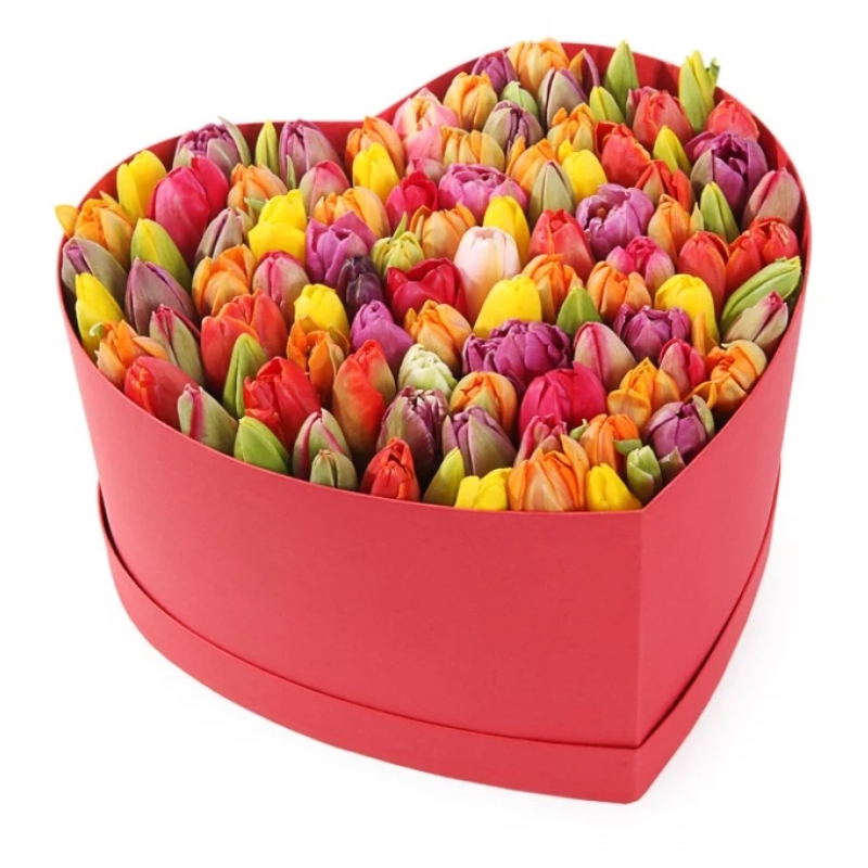 Букет состоит из MIX из 101 тюльпана, коробка в виде сердца, оазис.