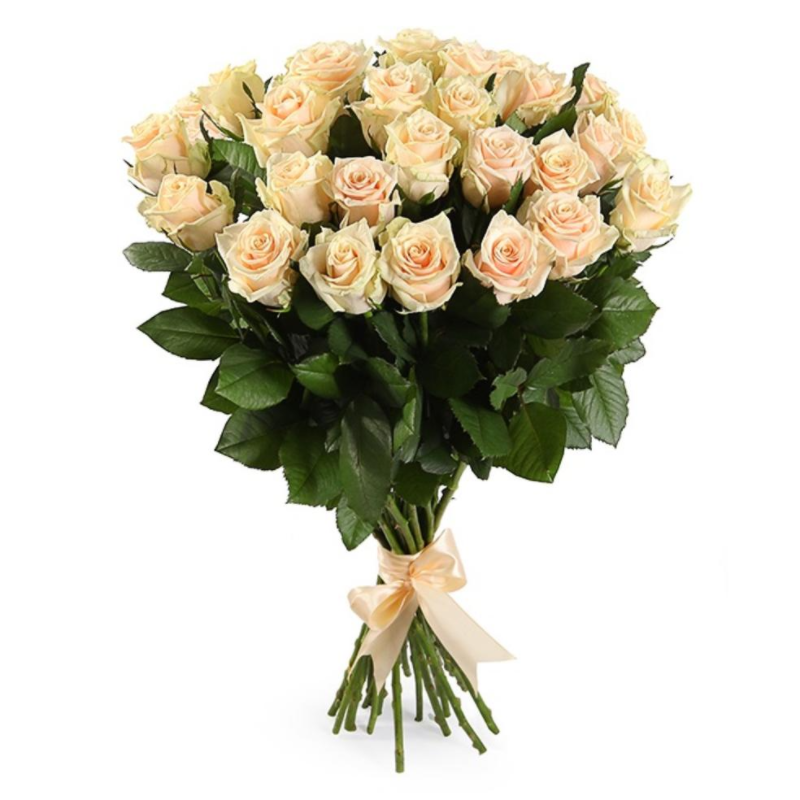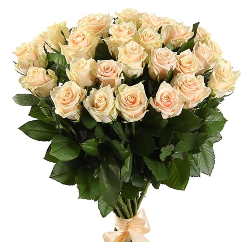 Букет состоит из 29 кремовых роз, прозрачная упаковка, атласная лента.