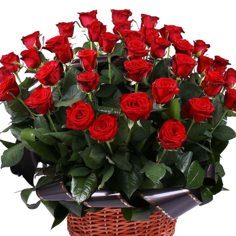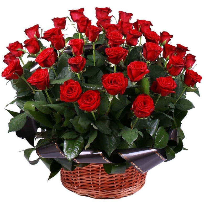 40 красных роз, зелень, корзина, оазис, траурная лента.