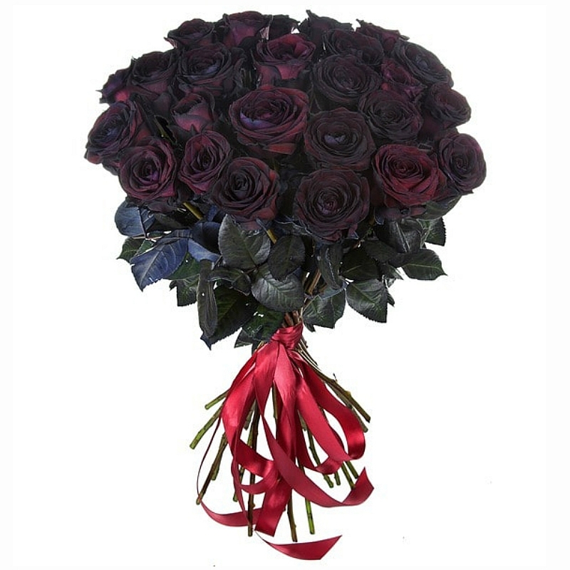 Букет состоит из 26 черных роз, прозрачная упаковка, атласная лента.