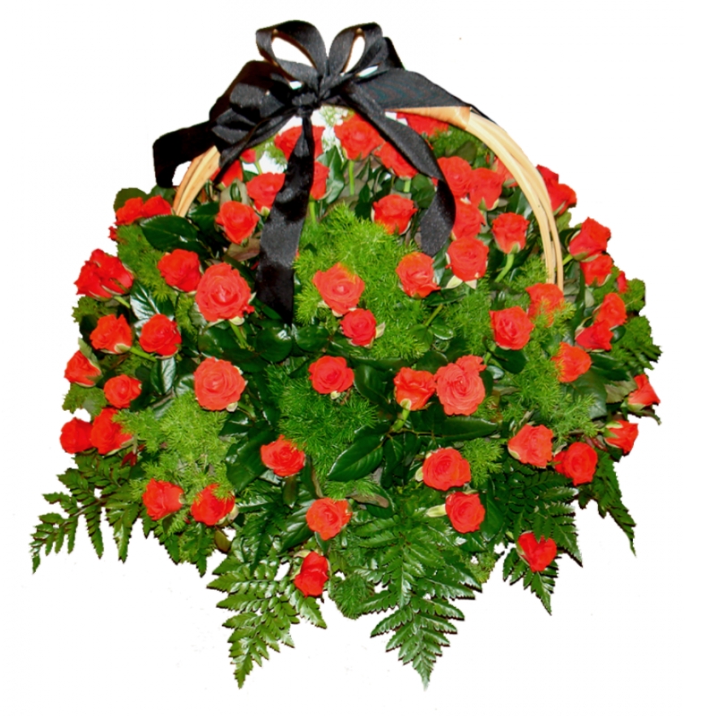 60 красных роз, зелень, корзина, оазис, траурная лента.