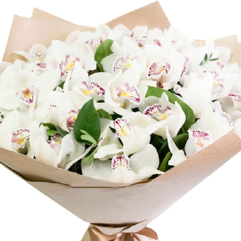 Букет состоит из 31 орхидея, зелень, крафт, атласная лента.