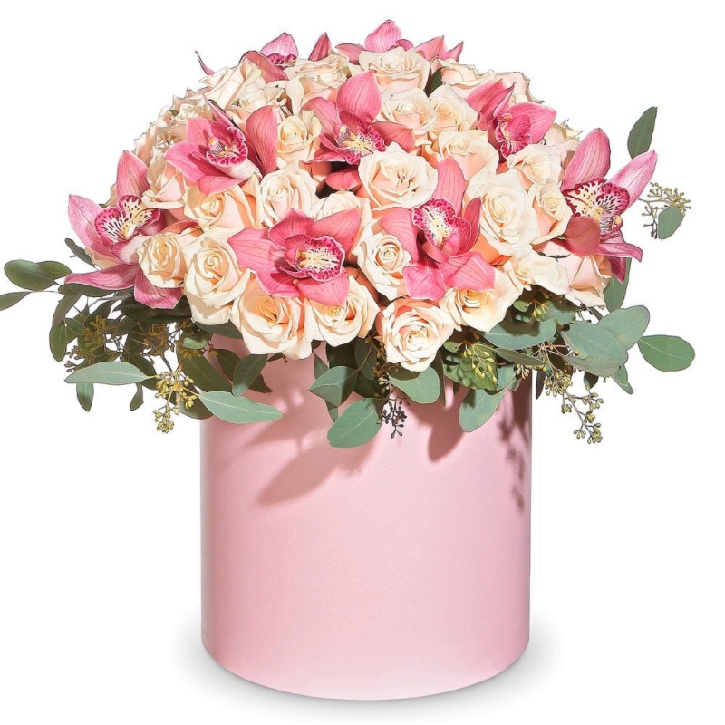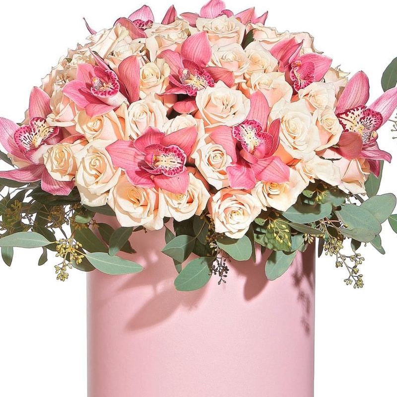 Букет состоит из 50 кремовых роз, 15 орхидей, зелень, коробка, оазис.