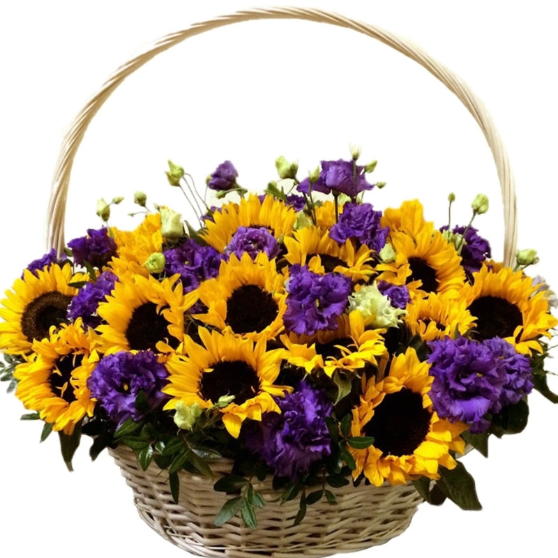 Букет состоит из 21 подсолнух, 11 веток эустомы, зелень, корзина, оазис.