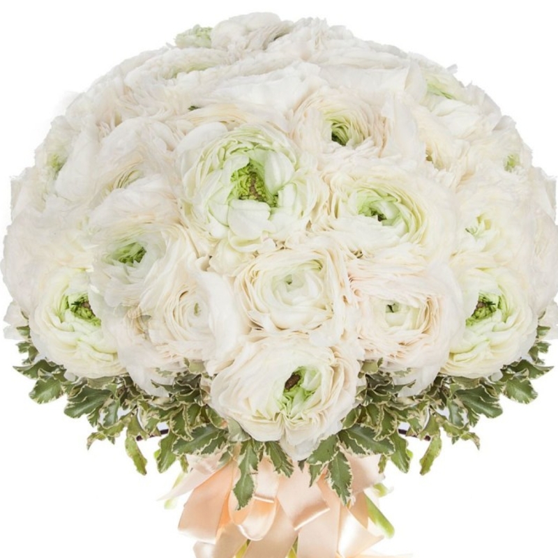 Букет состоит из 39 белых ранункулюсов, зелень, прозрачная упаковка, атласная лента.