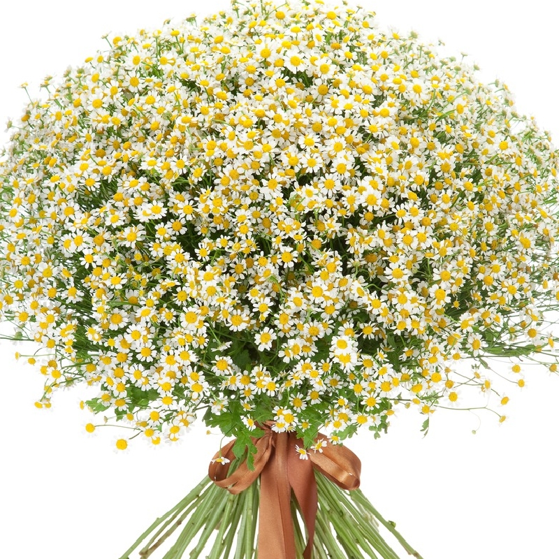 Букет состоит из 101 ветка танацетума, прозрачная упаковка, атласная лента.