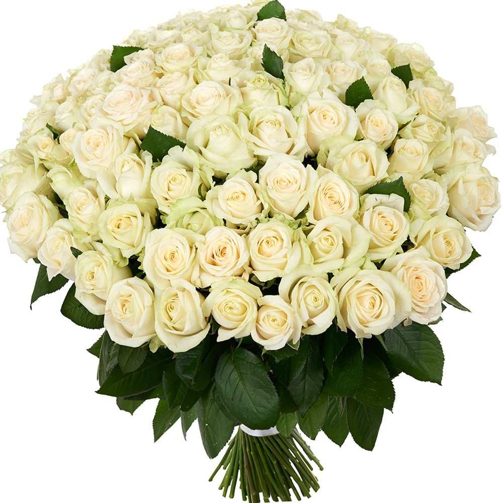 Букет состоит из 101 белая роза, прозрачная упаковка, атласная лента.