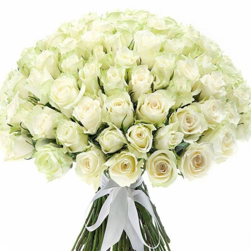Букет состоит из 101 белая роза Кения, прозрачная упаковка, атласная лента.