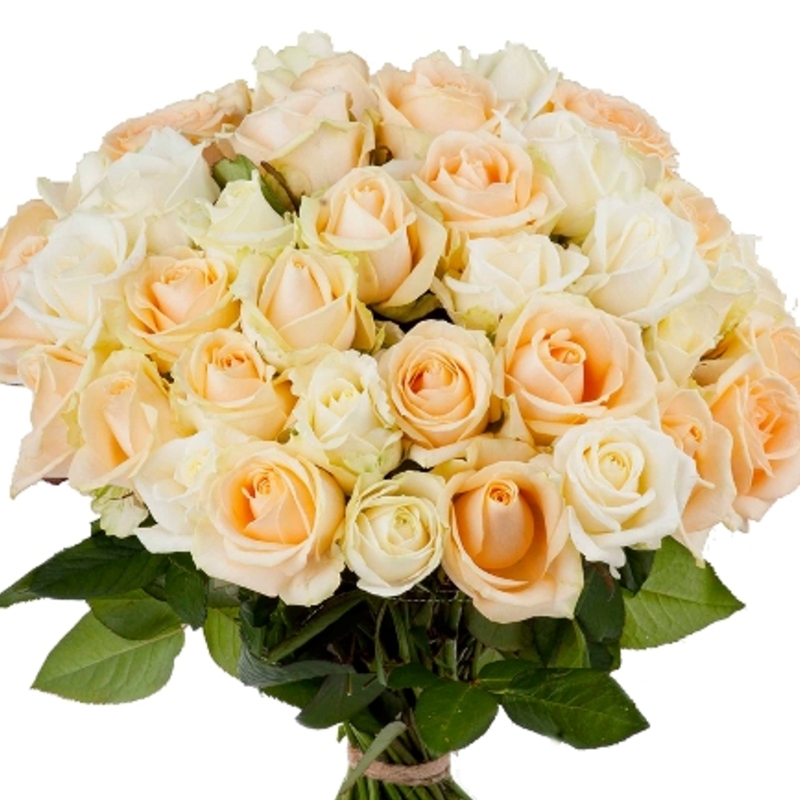 Букет состоит из 23 белые розы, 22 кремовые розы, прозрачная упаковка, атласная лента.